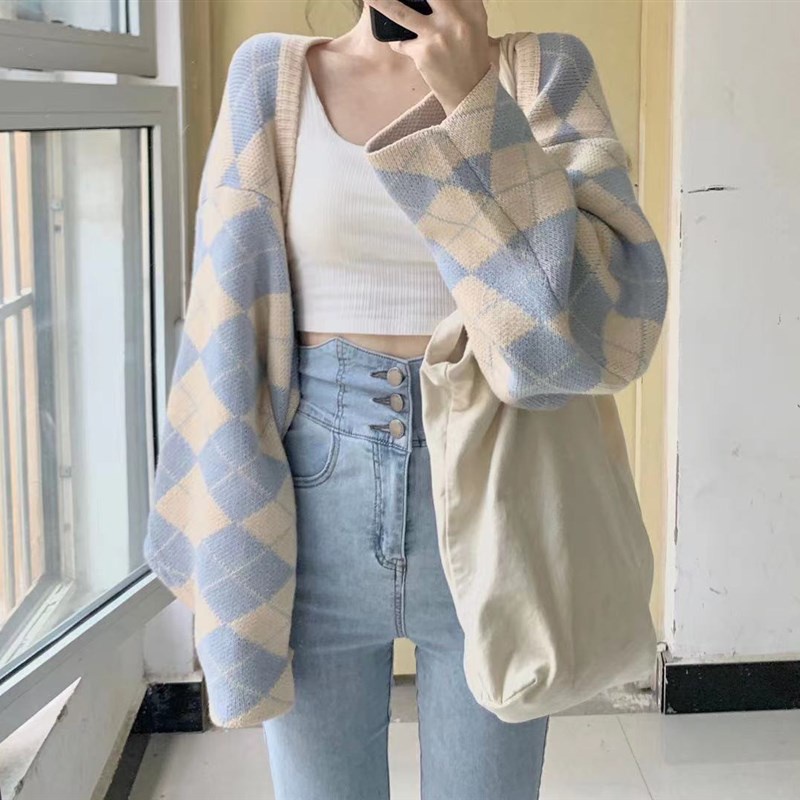 Korean style knitted cardigan women long sleeved plaid fashion Very well made.