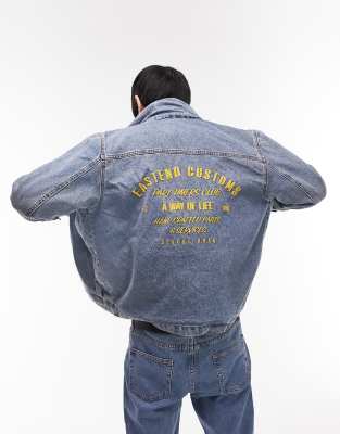 Topman Borg Collar Denim Jacket With Embroidery In Mid Wash Blue Very well made.