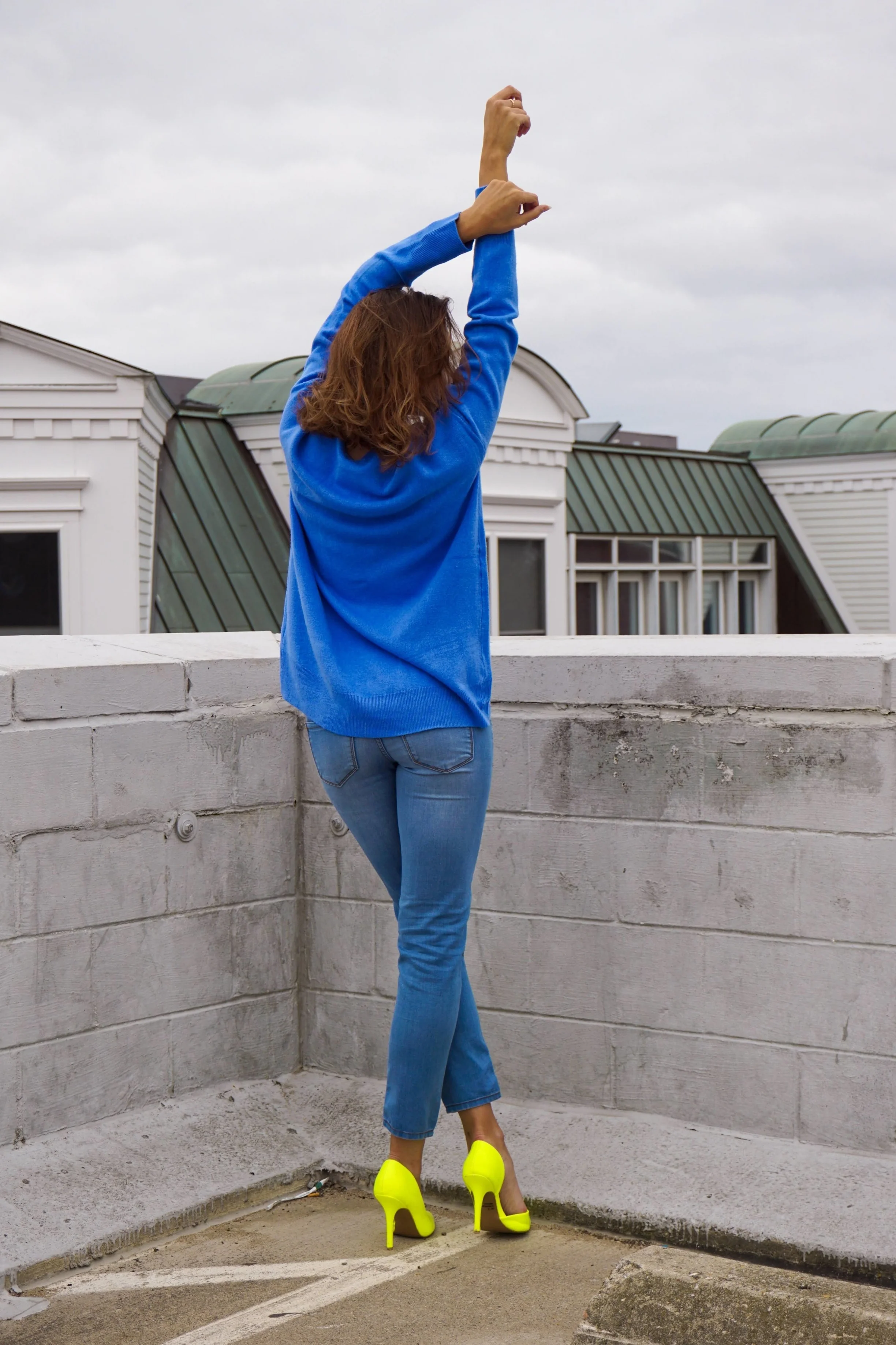 Not Your Typical Fall Look Blue Sweater Neon Yellow Heels Very well made.