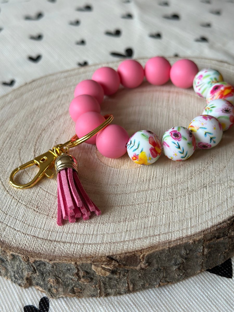 Pink and white exotic floral silicone beads keychain wristlet Very well made.