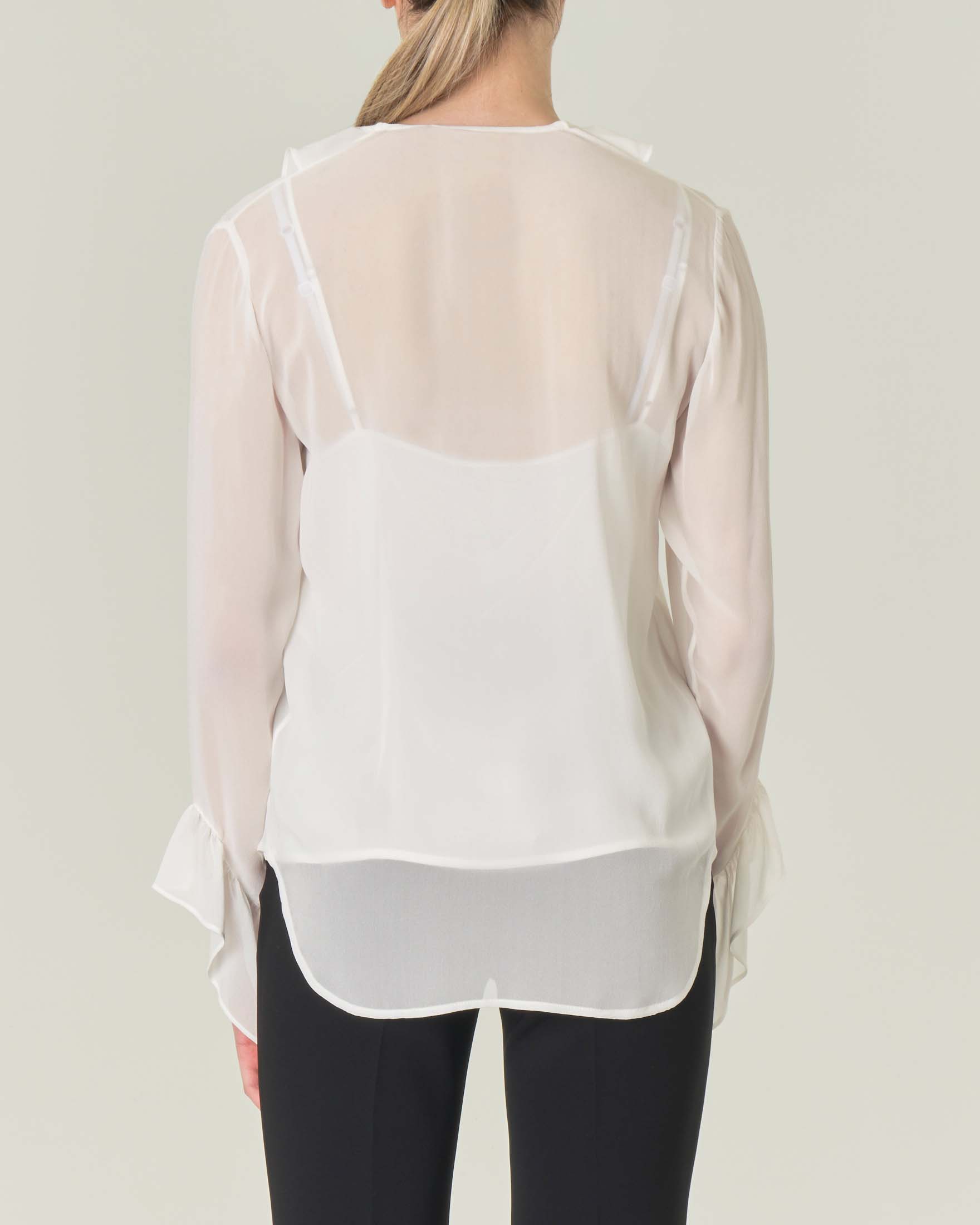 Blusa bianca in georgette di seta con volant sullo scollo a V e Very well made.