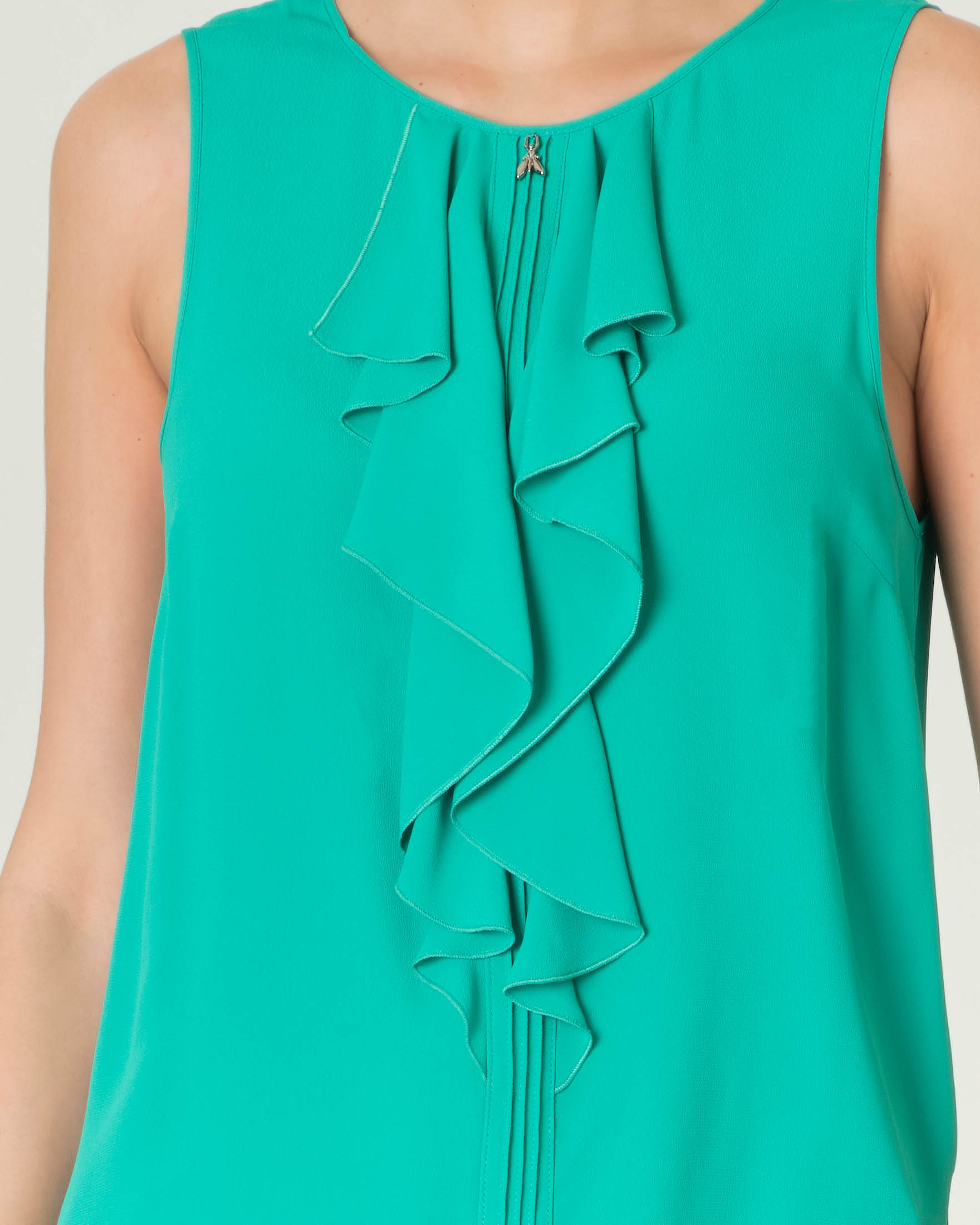 Blusa verde smeraldo senza maniche con volant applicati sul busto Very well made.