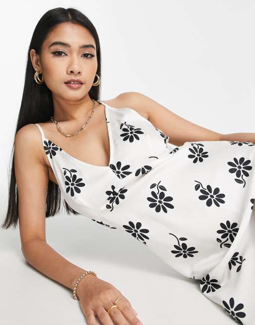 ASOS DESIGN high apex maxi slip dress in hammered satin in white base black floral print Very well made.