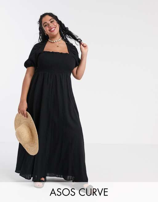 ASOS DESIGN Curve shirred bustier maxi dress with puff sleeve in seersucker in black Very well made.