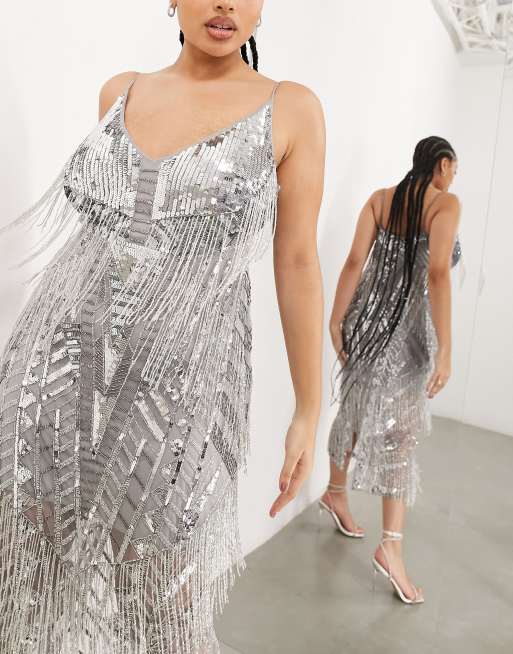 ASOS EDITION Curve Robe mi longue bretelles fines avec franges et sequins Argent Very well made.