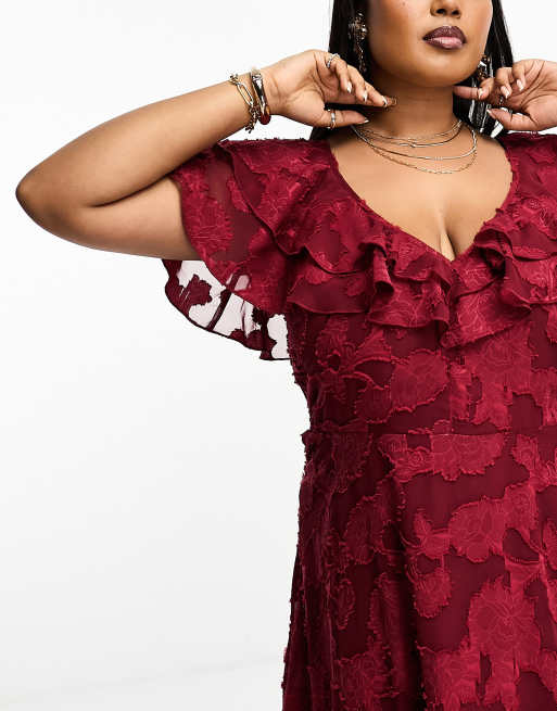 ASOS DESIGN Curve v front v back ruffle midi dress with flutter sleeve and tie back in textured burnout in burgundy Very well made.