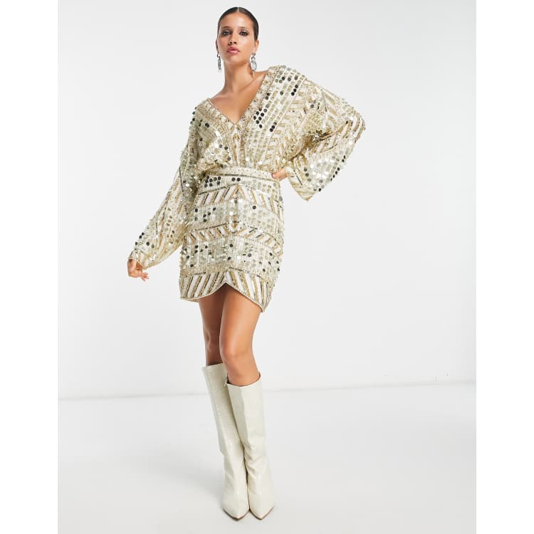 ASOS DESIGN embellished patchwork mini dress with waist detail in gold Very well made.