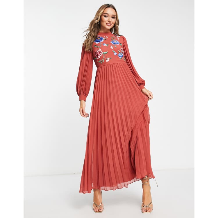 ASOS DESIGN high neck pleated embroidery maxi dress in rust Very well made.
