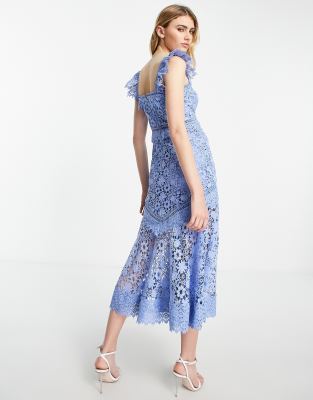 ASOS DESIGN Premium lace midi dress with ruffle detail in blue Very well made.