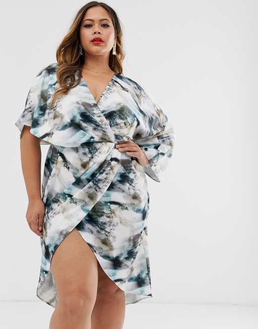 ASOS DESIGN Curve satin kimono midi dress with knot front and asymmetric sleeve in abstract Print Very well made.