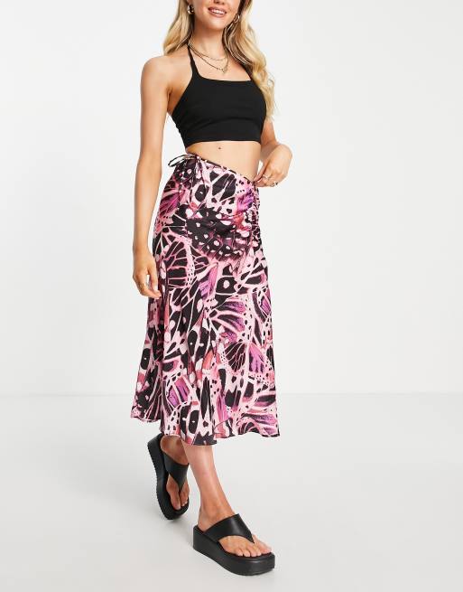 ASOS DESIGN Jupe patineuse mi longue fronc e sur le devant satin e imprim papillon Very well made.