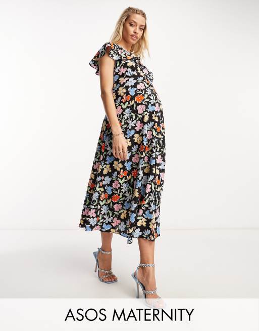 ASOS DESIGN Maternity flutter sleeve midi tea dress with buttons in multi floral print Very well made.
