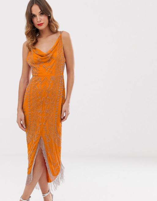 ASOS Pearl Embellished Cami Midi Dress With Fringe in Orange Lyst Very well made.