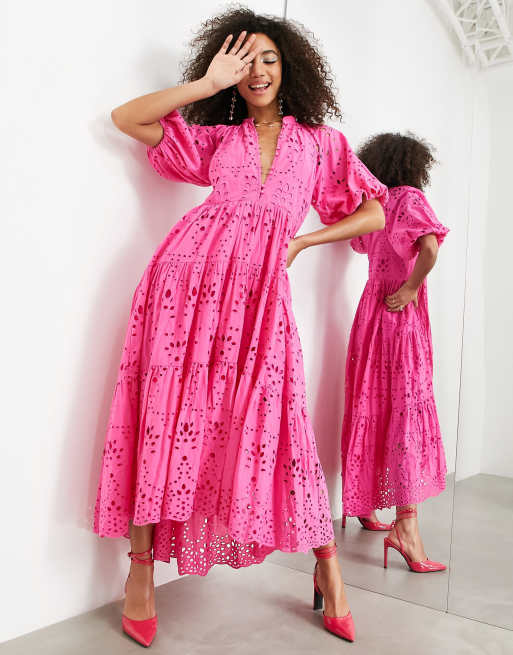 ASOS EDITION button front tiered eyelet maxi dress in bright pink Very well made.