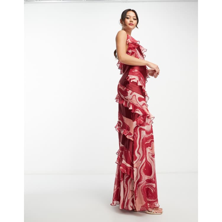 ASOS DESIGN satin bias ruffle maxi dress in red with marble print Very well made.