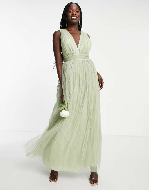 ASOS DESIGN Robe longue plongeante de demoiselle d honneur en tulle avec n ud au dos Sauge Very well made.