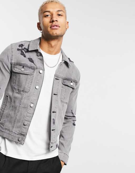 ASOS DESIGN skinny denim jacket in grey with rips Very well made.