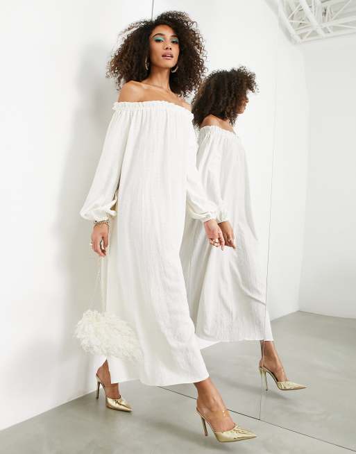 ASOS EDITION off shoulder midi dress in textured check in oatmeal Very well made.