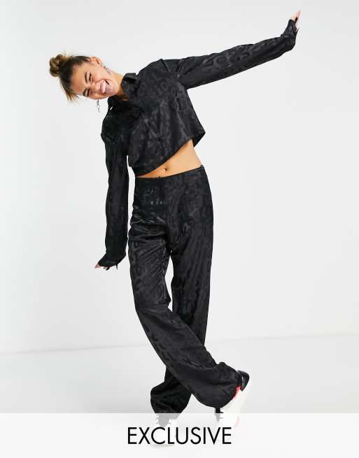 COLLUSION satin branded jacquard low rise wide leg trousers co ord in black Very well made.