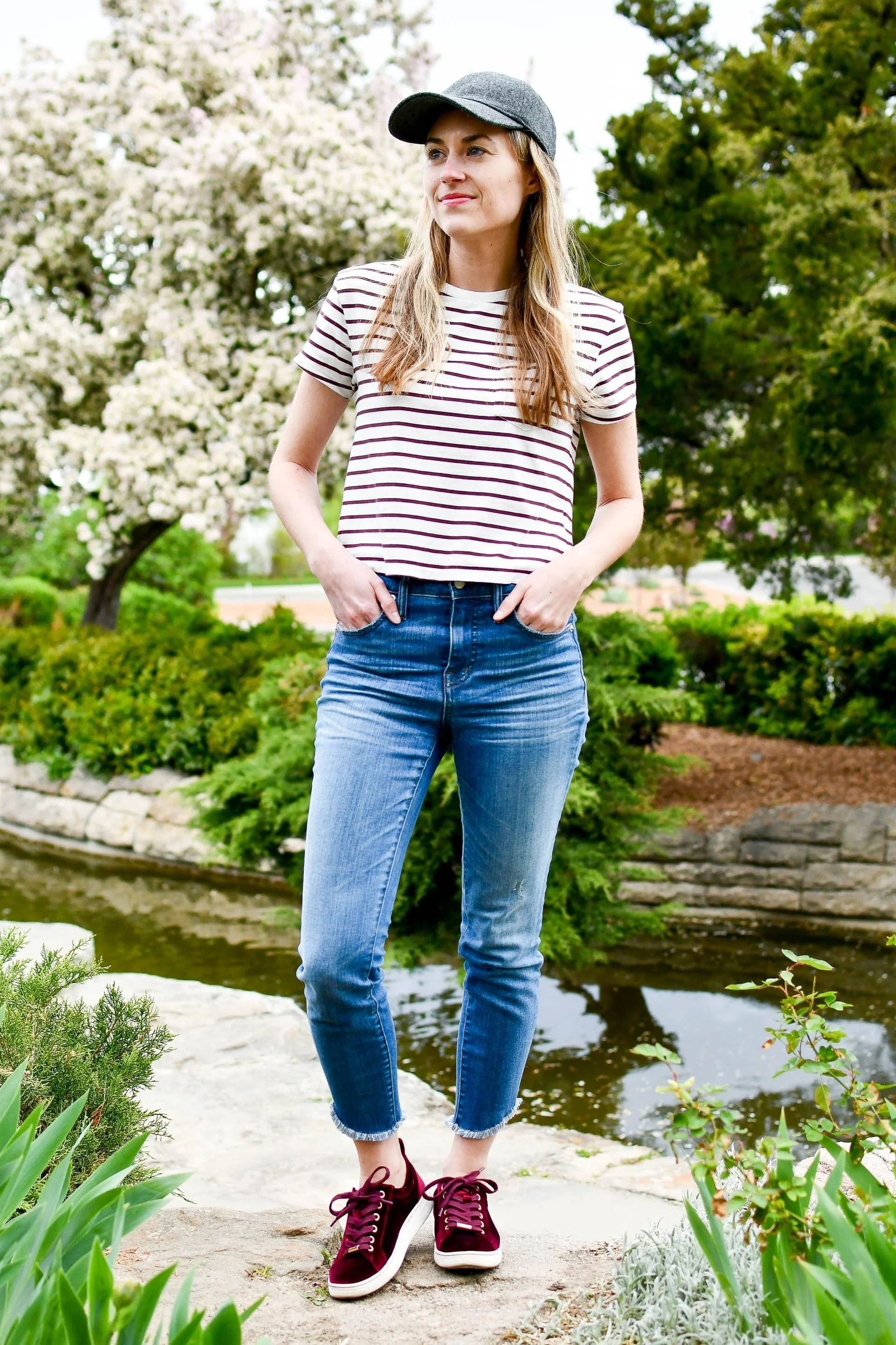 Burgundy Bomber Jacket Graphic Tee Jeans with Sneakers Outfit Very well made.
