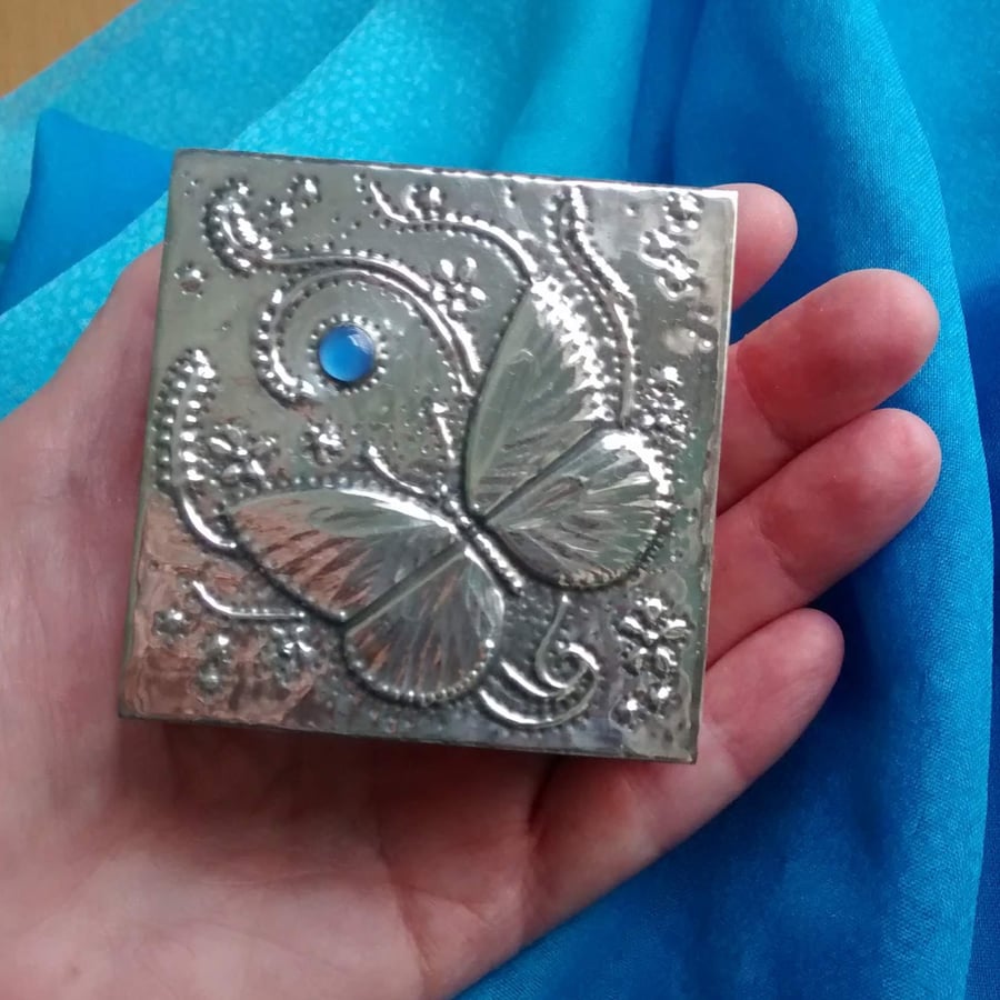 Butterfly Ring Box Handmade in Pewter with Blue Onyx Cabochon Very well made.