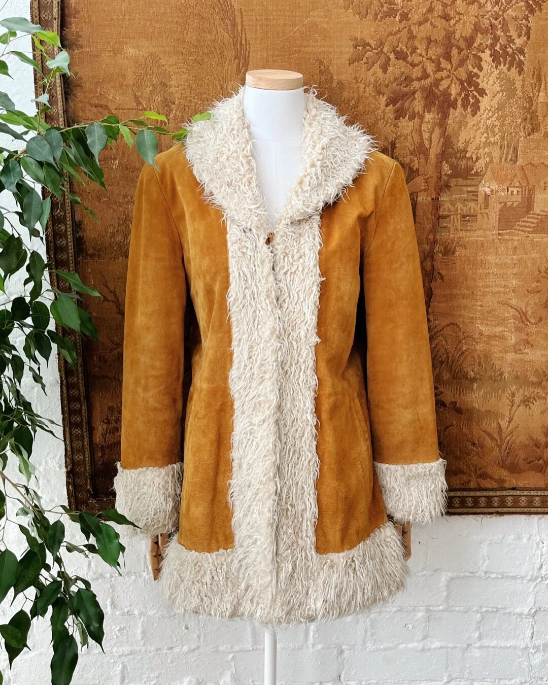1970s Brown Suede Coat Sheepskin Trim Rock Follies Vintage Very well made.