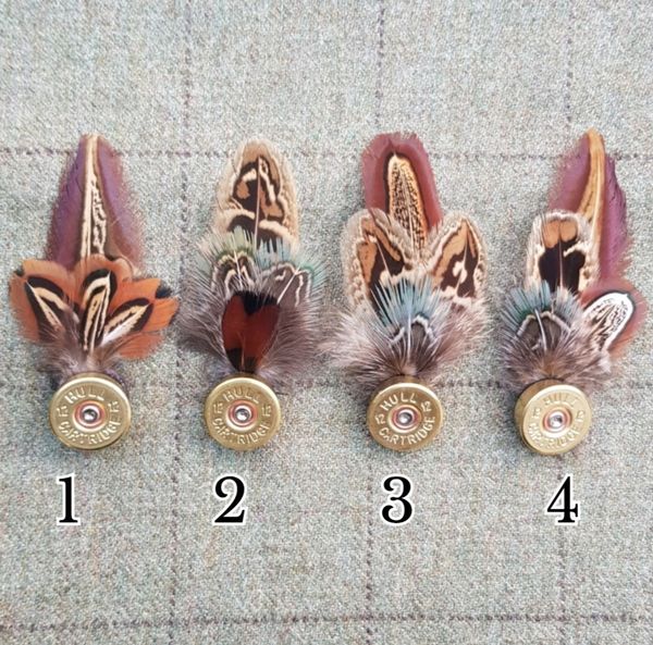 Shotgun cartridge Pheasant feather brooch pin. comes boxed Very well made.