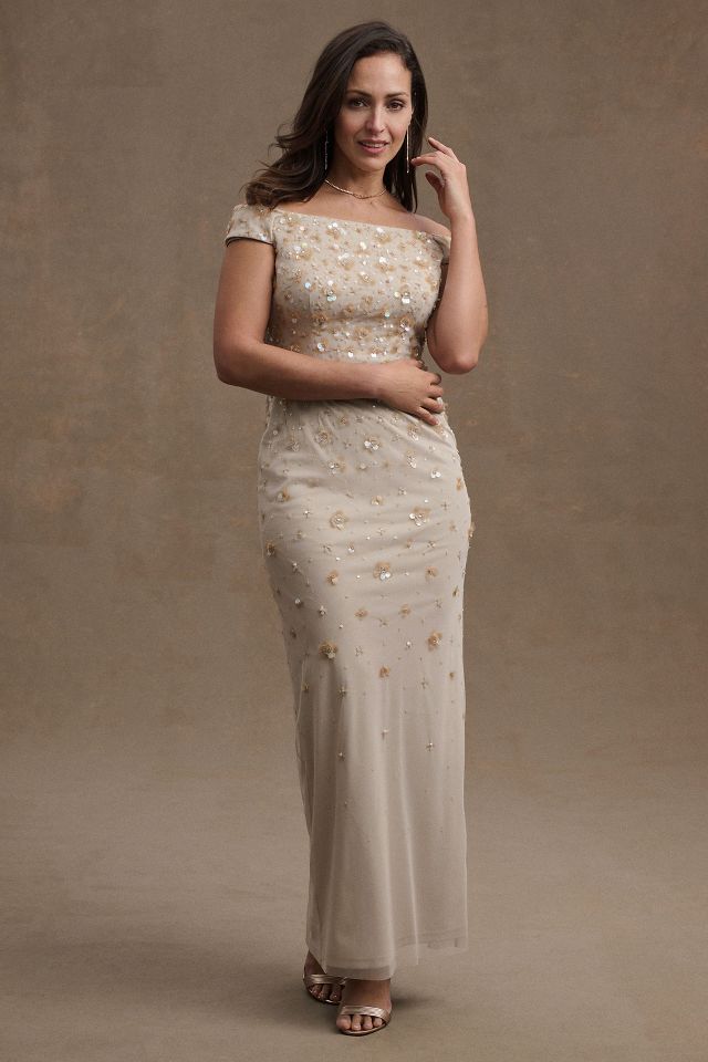 BHLDN Rosie Off Shoulder Beaded Back Slit Column Gown Anthropologie Very well made.