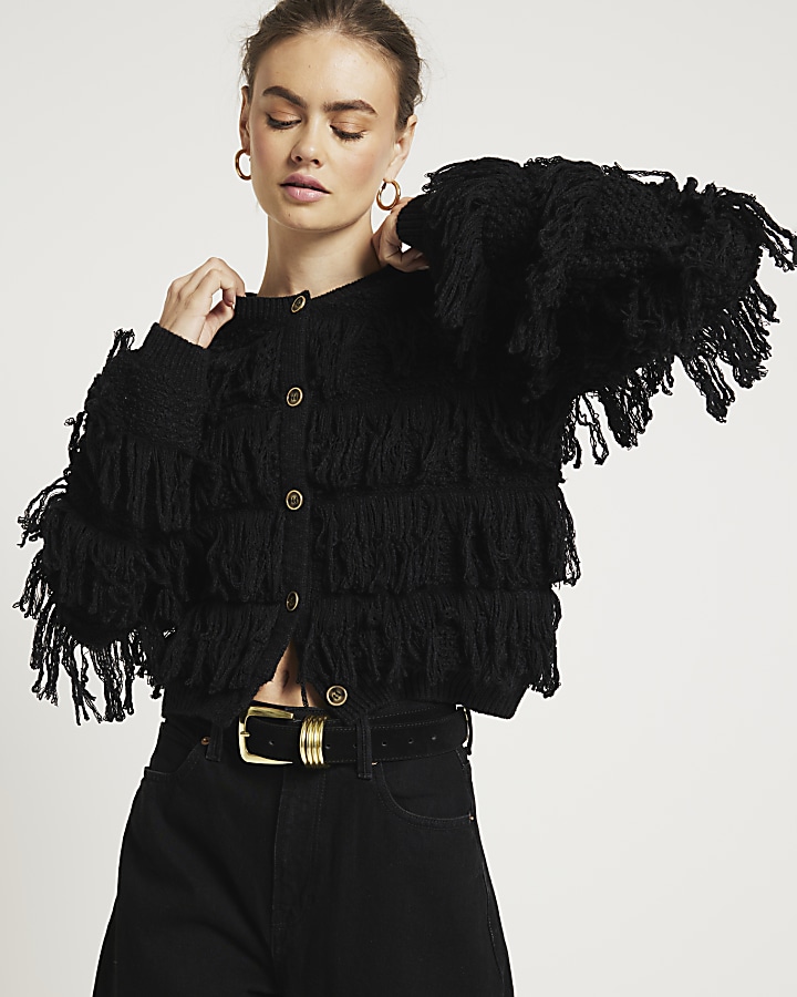 JoosTricot Black Linen Fringe Crop Cardigan Very well made.